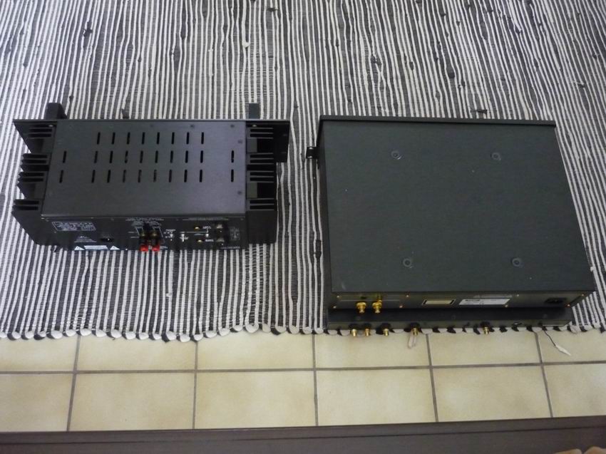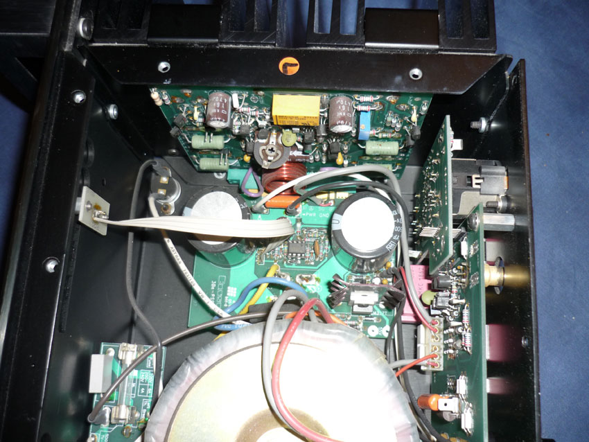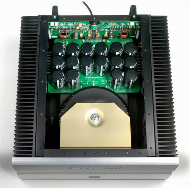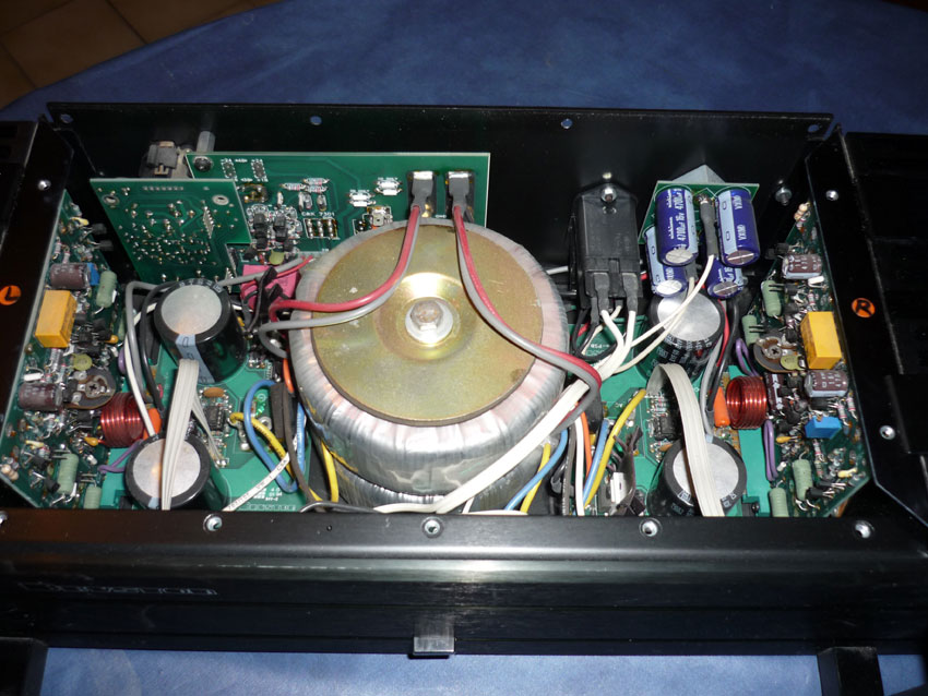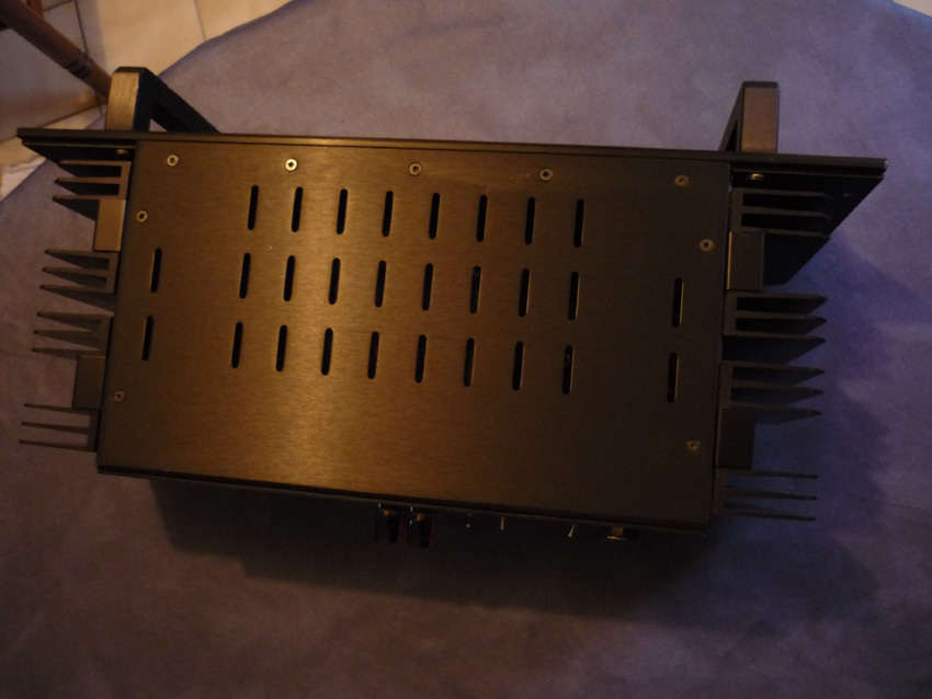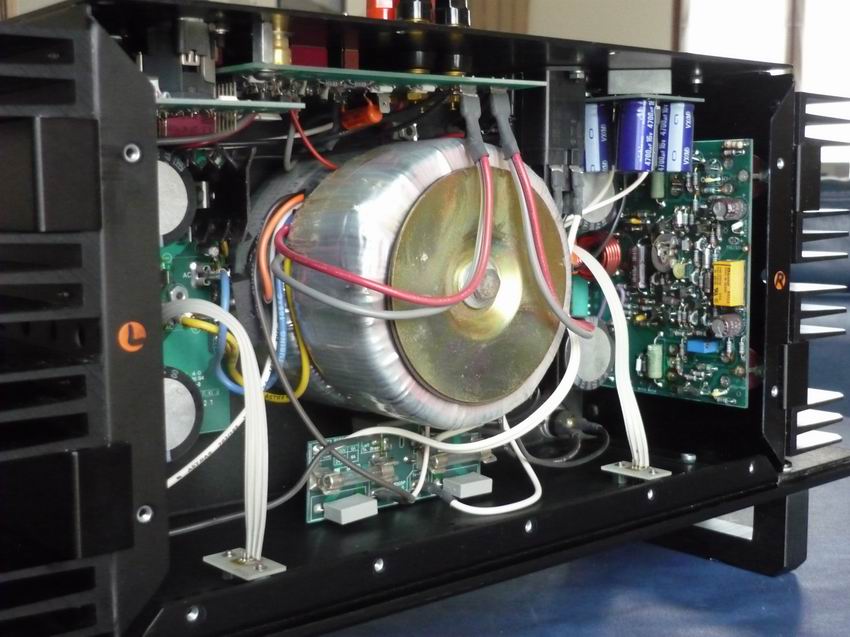L'arrière comporte des connecteurs plaqués or cinch et XLR en entrée, un commutateur mono/stéréo, 2 paires de borniers pour prises HP bananes; tous les connecteurs sont soudés directement sur les cartes .